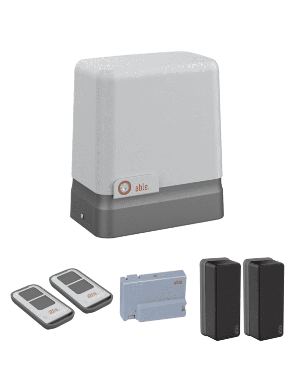 The 23Y004 is a ABLE V2 230v Irreversible electromechanical motor for sliding gates weighing up to 800 kg. In a kit, supplied with a plug in receiver, 2 x 2 button transmitters and 1 x set of safety photocells. The gear rack is sold separately.
