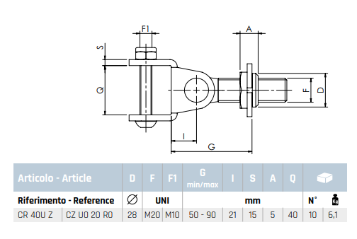 CR 40 UZ Adjustable Hinge & support for 40mm Square tube to be Welded M20 thread & screw