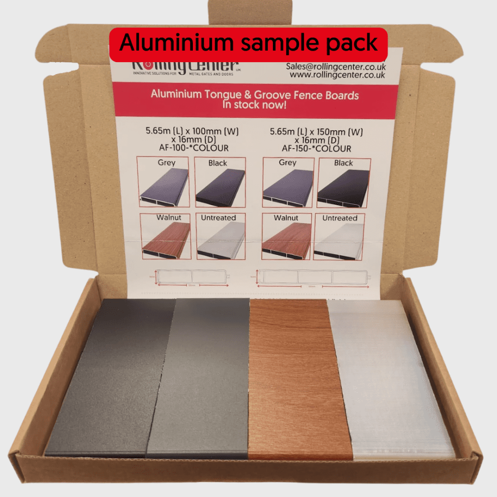 150mm width sample pieces of the superior 4 quality finishes of aluminum tongue and groove fencing slats.