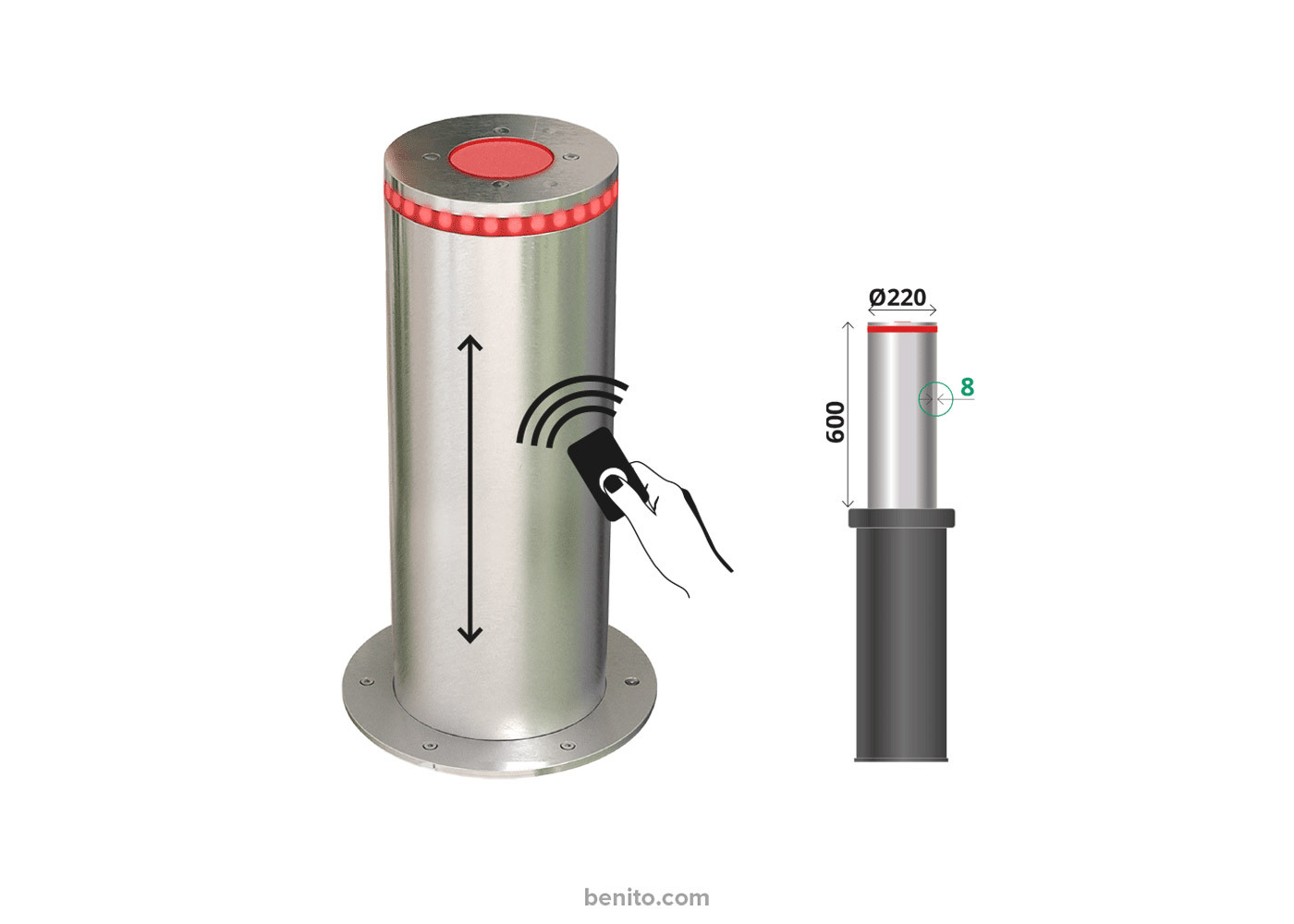 The Benito stylish range of hydraulic bollards has an impressive performance of fast raising and lowering speeds of 3-4 seconds. Designed with maximum security in mind and an impressive impact resistance. Each bollard has a red/green LED light crown with traffic light function to maximise visibility.