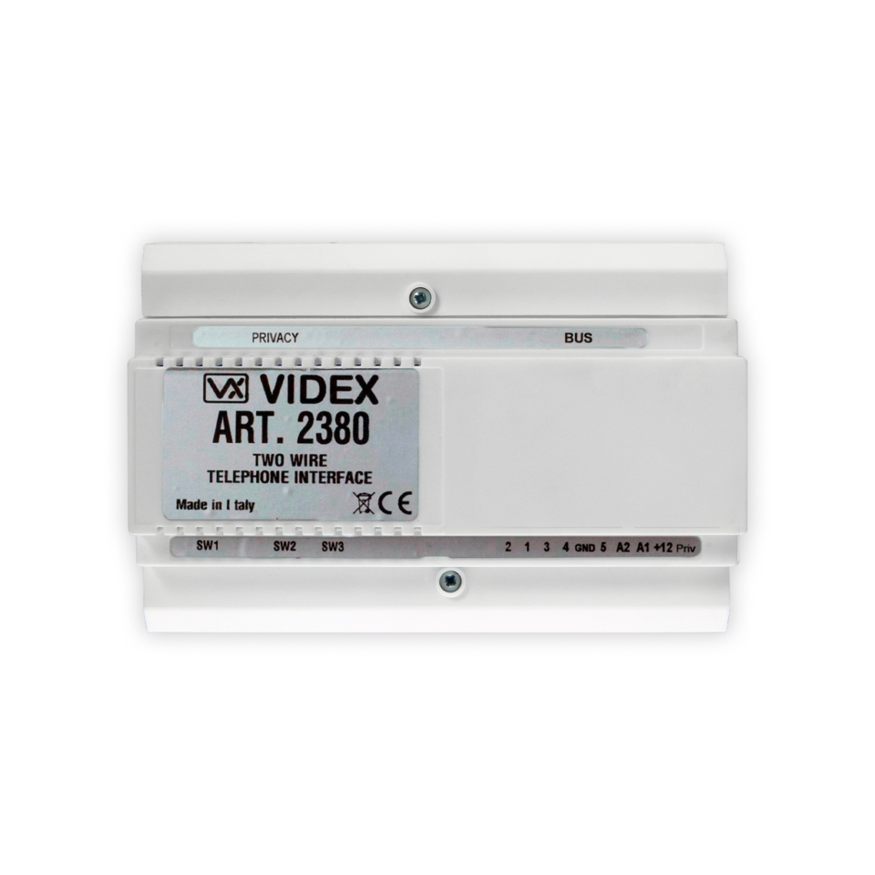 The 2380 allows to connect 380 and 275 interfaces to the VX2300 digital system. Thanks to these interfaces, a normal telephone (a landline telephone or laptop) acts as an intercom handset. The unit is housed in a 9-module DIN-A-type plastic box , and it can be surface or DIN bar mounted.